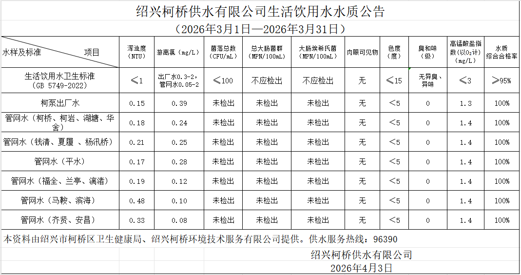生活飲用水水質公告(2026年3月1日—2026年3月31日)