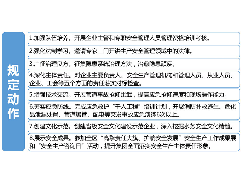 本屆安全生產(chǎn)文化月以宣傳貫徹中共中央國(guó)務(wù)院《關(guān)于推進(jìn)安全生產(chǎn)領(lǐng)域改革發(fā)展的意見(jiàn)》為主線,以“全面落實(shí)企業(yè)安全生產(chǎn)主體責(zé)任”為主題,以創(chuàng)建省級(jí)安全文化建設(shè)示范企業(yè)為契機(jī),立足集團(tuán)公司“四全、四化”安全體系建設(shè)中心,通過(guò)開(kāi)展八項(xiàng)“規(guī)定動(dòng)作”和七項(xiàng)“特色活動(dòng)”,強(qiáng)化安全“紅線”意識(shí),弘揚(yáng)水務(wù)安全文化,為促進(jìn)集團(tuán)可持續(xù)安全健康發(fā)展提供有力的思想保證、文化條件和輿論支持。