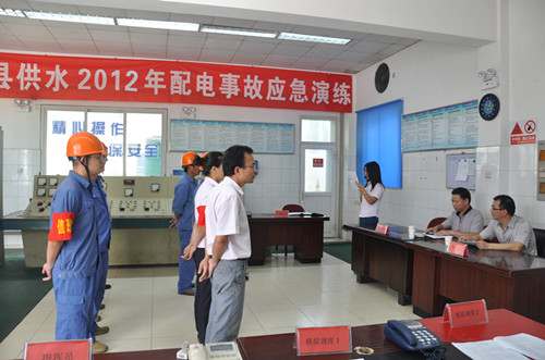 為全面深化安全生產月活動,提高部門職工對突發事故的分析與應急處理能力,確保全縣供水系統安全可靠的運行,6月29日,公司在鳳凰山泵站舉行2012年配電反事故應急演練。