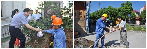 717上午,集團公司黨委副書記、紀委書記高小林、副總經理王嘉賢在公司領導的陪同下,到城區唯美品格紫薇園和紫郡花園工地現場慰問供水一線職工,送上防暑慰問品,并叮囑大家在高溫酷暑下作業要注意做好防暑措施。